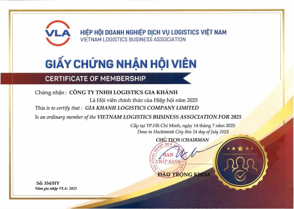 Ngày 14 tháng 7 năm 2025, Công ty TNHH Logistics Gia Khánh vinh dự được kết nạp là Hội viên chính thức của Hiệp hội Doanh nghiệp Dịch vụ Logistics Việt Nam (VLA) – tổ chức nghề nghiệp hàng đầu trong lĩnh vực logistics và chuỗi cung ứng tại Việt Nam.
